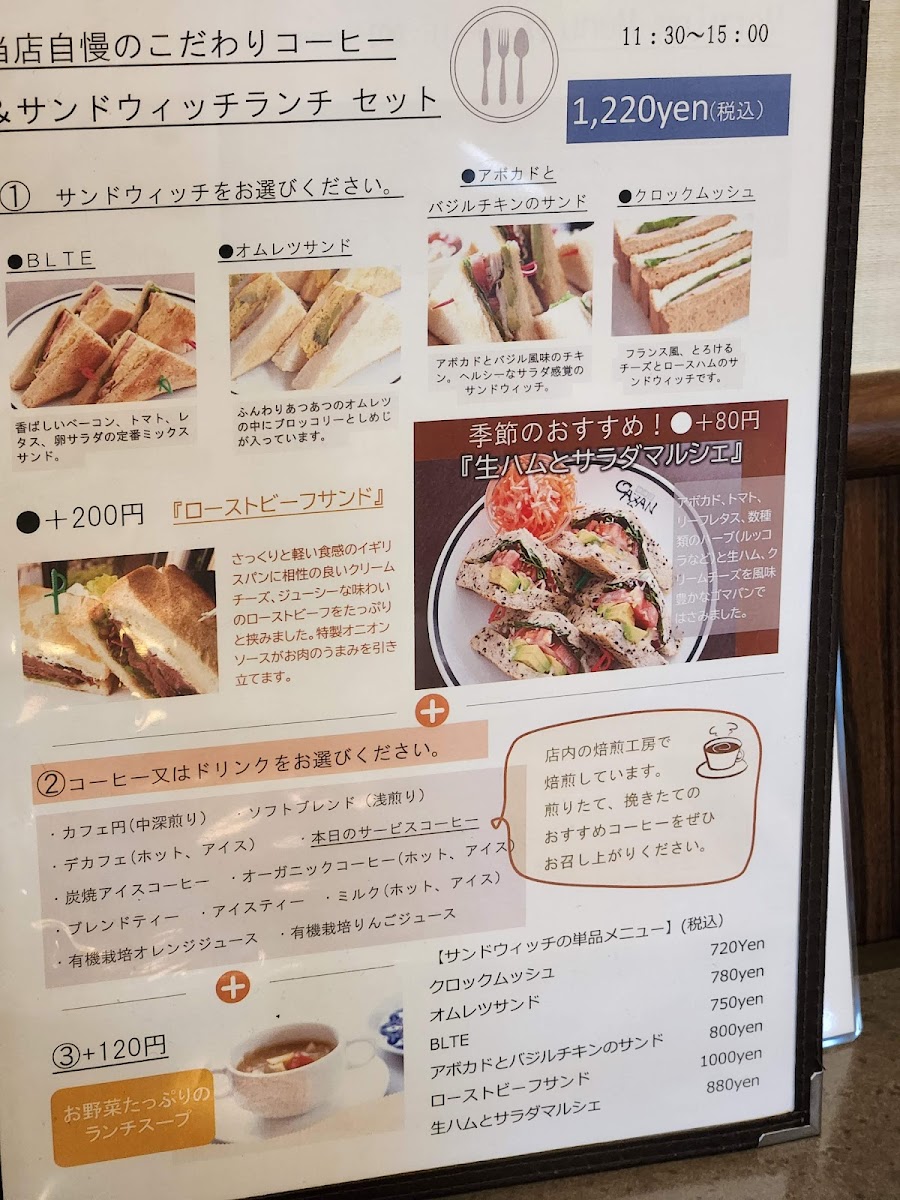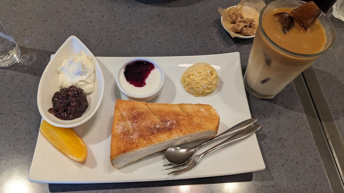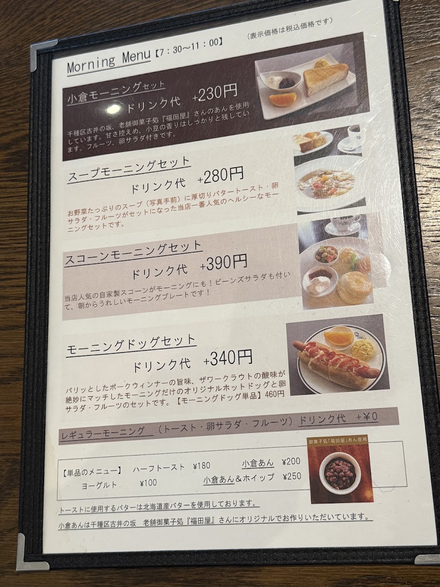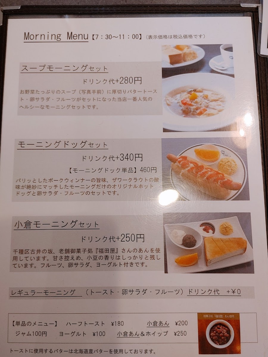 The menu is a delightful exploration of flavors, showcasing a variety of carefully curated coffee blends and mouth-watering dishes. One standout choice is the モーニングメニュー: サラダモーニングセット, a health-conscious delight featuring a vibrant salad bowl packed with fiber and vitamins. Accompanied by thick slices of buttery toast, egg salad, and refreshing yogurt, this morning set is not only delectable but also nutritious—perfect for kickstarting your day. For a more traditional Japanese sweet experience, the 小倉モーニングセット offers a subtly sweet red bean paste that pairs beautifully with rich cream and fluffy brown sugar bread, creating a classic yet delightful morning meal.